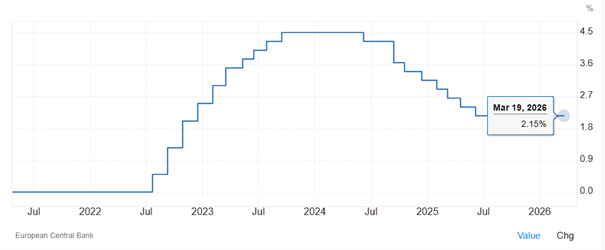 ECB na zasedání 19. 3. 2026 také ponechala úrokové sazby na stávající úrovni 2,15 %. Aktuálně by kvůli rostoucím cenám pohonných hmot dokonce mohlo přijít mírné zvyšování úrokových sazeb.