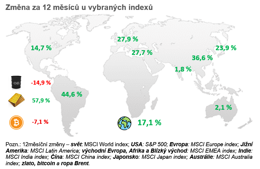 A jak se dařilo ostatním aktivům? Zlato po menší korekci na 4 000 USD znovu rostlo a dosahuje ceny přes 4 200 USD.