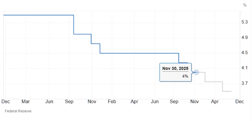 Důležité bude zasedání Fedu, které se bude konat v první polovině prosince. Zde se většinově očekává, že Fed sníží úrokové sazby na 3,75 %. Pro rok 2026 se celkově očekává snížení na 3,5 %.