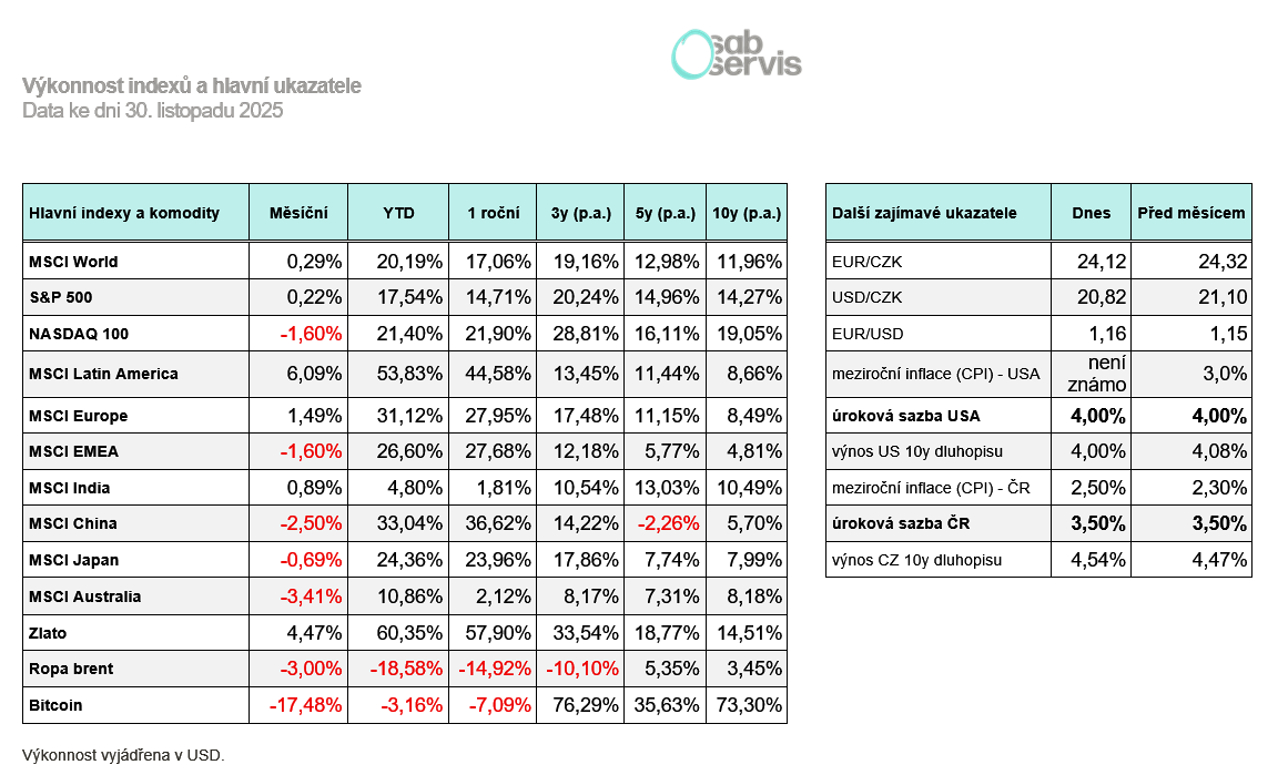 Akcie v podobě indexu S&P 500 zažily v listopadu mírnou korekci ve výši přibližně 7 %. Technologické akcie klesaly o trochu více a NASDAQ 100 odepsal přes 10 %. Důvodem byly pravděpodobně obavy z konce AI boomu a celkově obavy z akciové bubliny.