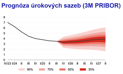 Podle predikce by do konce roku mohlo dojít ještě k mírnému snížení úrokových sazeb na 3,25 %. ČNB ale spíše očekává naopak postupný růst úrokových sazeb do roku 2027.