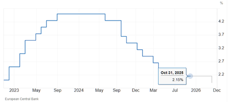 ECB se na posledním zasedání 31. října 2025 rozhodla pro ponechání úrokových sazeb na 2,15 %. Nadále nevidí důvod, proč by v dalším snižování úrokových sazeb pokračovala, a spíše až ke konci roku 2026 by mohlo dojít k mírnému snížení.