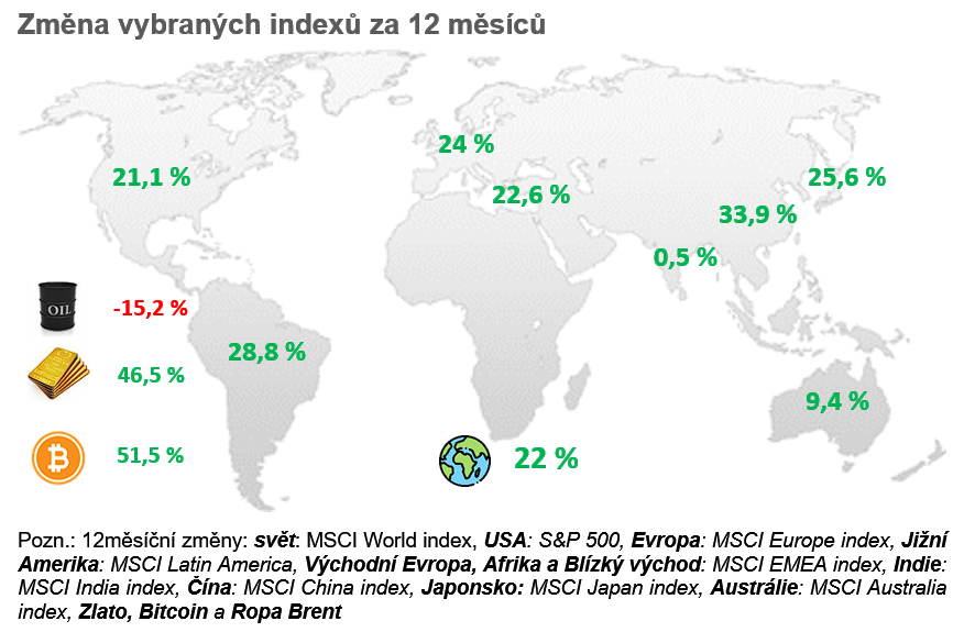 A jak se dařilo ostatním aktivům? Zlato nám nepřekvapivě rostlo a dosáhlo téměř na 4 400 USD. Pak došlo k menší korekci a aktuálně jsme na cenách kolem 4 000 USD.
