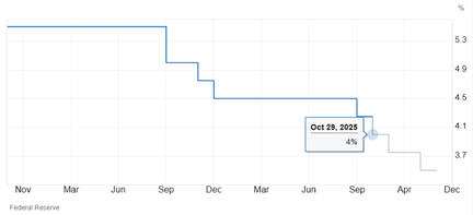 29. 10. 2025 se konalo očekávané významné zasedání Fedu, který pokračuje ve snižování úrokových sazeb ze 4,25 na 4 %.