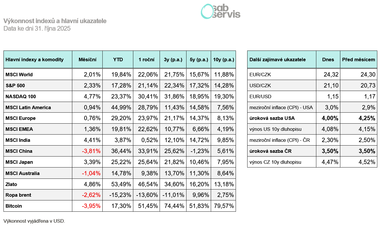 Během října akcie pokračují v růstu na pozitivní vlně výsledkové sezony, kde reportovaly hlavně velké technologické firmy. Ty přinesly kvalitní výsledky a AI boom tak zatím pokračuje.