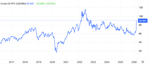 Cena ropy od začátku konfliktu prudce roste a z 67 USD stoupla až na 90 USD. Začíná se skloňovat, že by mohla kvůli růstu ceny ropy nastat další inflační vlna a potažmo ztracená dekáda na akciových trzích. K tomu ale máme zatím daleko a USA se svou až 20% celosvětovou produkcí ropy jsou v lepší situaci, než tomu bylo v 70. letech.
