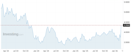 Problémem ale začíná být rostoucí výnos na 5letých a 10letých státních dluhopisech, kde konkrétně 5letý výnos vzrostl z 3,7 až na současných 4,3 %. Důvodem je válečný konflikt na Blízkém východě, rostoucí cena ropy a očekávaná vyšší inflace.