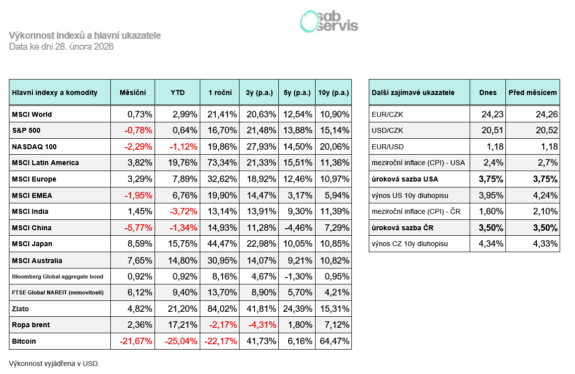 Index S&P 500 během února mírně klesal, konkrétně –0,78 %. Od počátku válečného konfliktu o několik % poklesl, ale víceméně se drží a nyní (10.03.2026) se nacházíme zhruba 4 % pod vrcholy, což je téměř nic.